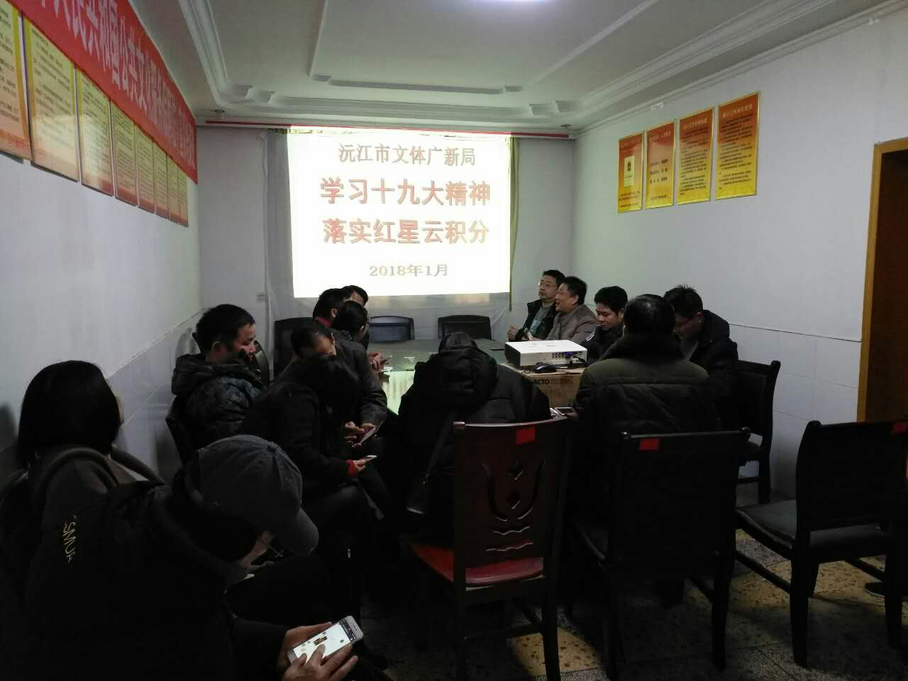 1月11日上午,市文体广新局机关党支部组织全体党员在局机关会议室开展以“学习十九精神 落实红星云积分”主题党日活动。会前各位党员们庄严地举起右手,面对党旗重温入党誓词,进一步增强党性观念。会上先由分管党建副局长陈海军讲授了以《学习习近平总书记系列重要讲话精神》的主题党课,再由党支部组织委员李畅宣读市委组织部《关于开展“学习十九精神 落实红星云积分”主题党日活动的提示》的文件,最后各位党员现场缴纳了本月党费。